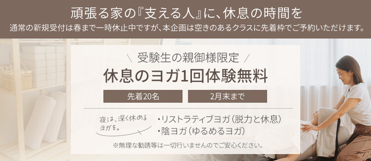 先日は体験レッスンを受講させて頂き、ありがとうございました。先生のお人柄に溢れた、とても楽しいクラスでした。それだけでなく、大事な試験の前日に心を落ち着けたい気持ちもあり参加させて頂いたのですが、呼吸法の中で『やるべきことをやれば結果はついてくる』というようなアナウンスがあって、とても勇気づけられました。お陰様で無事合格しました。また癒しや励みを求めて参加させて頂きます。ありがとうございました。